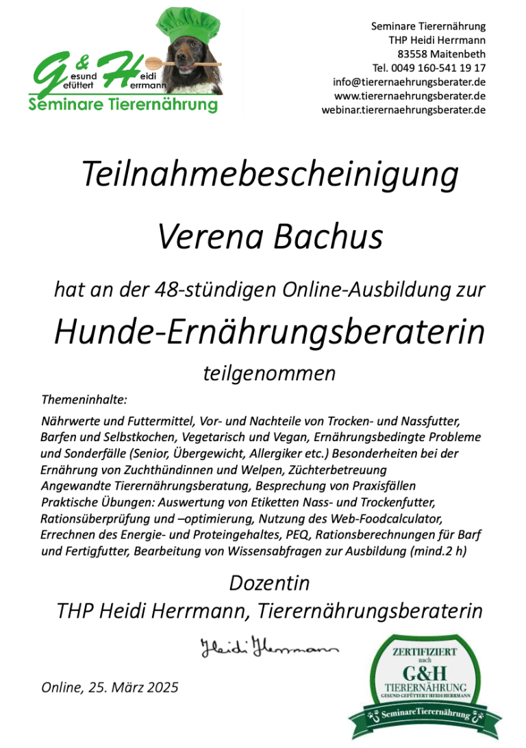Ich habe die Ausbildung zur Ernährungsberaterin bei Heidi Hermann gemacht und die Prüfung bestanden.